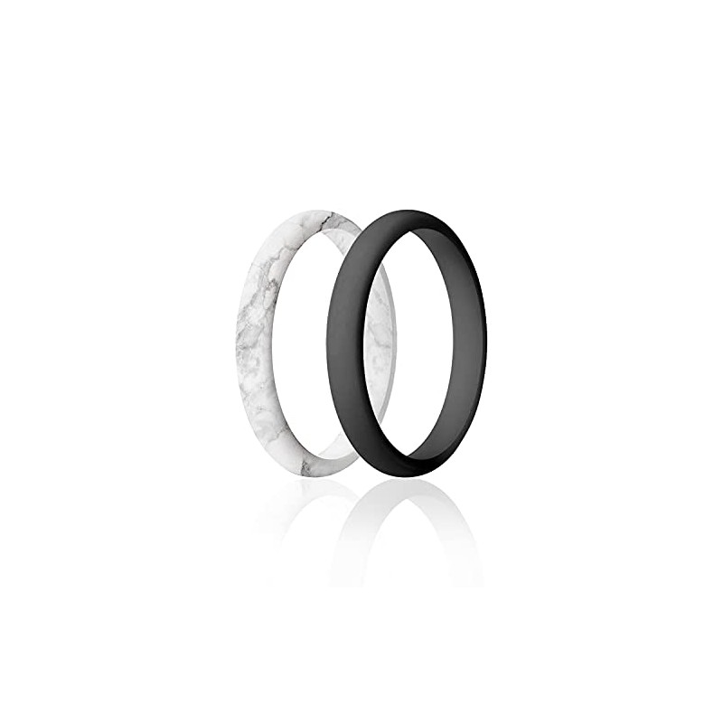 ROQ Silicone Rubber Wedding Ring for Women, Thin Stackable Rubber Silicone Wedding Band, Bridal Jewelry Set, Promise Ring, Point Pave Edge, 2.5mm Wide 2mm Thick, 2 Pack, Marble & Black, Size 4