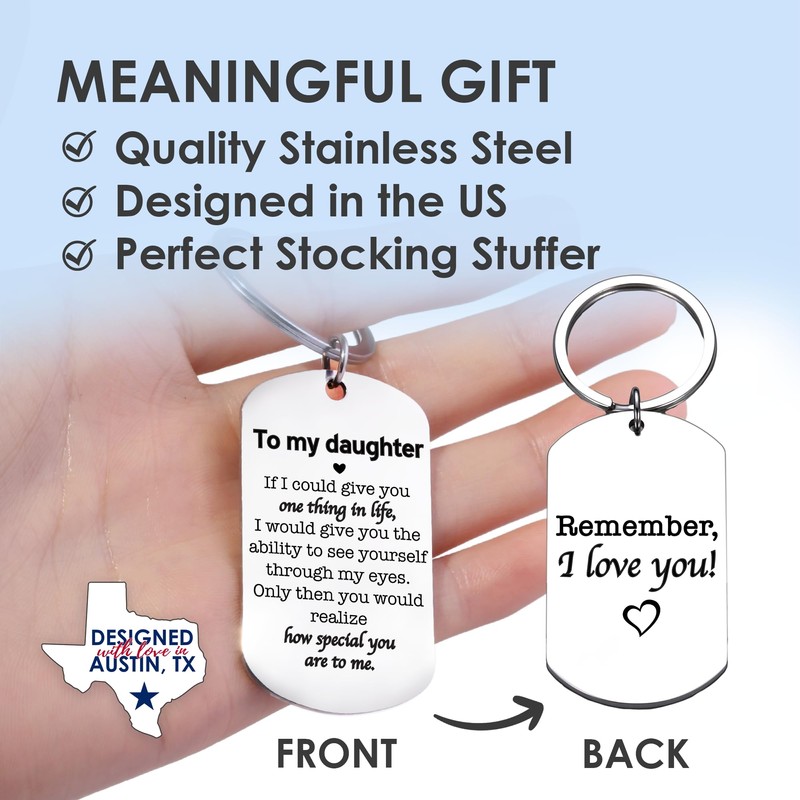 To My Daughter Keychain: Crafted from durable stainless steel, this keychain embodies a heartfelt message: "If I could give you one thing in life, I would give you the ability to see yourself through my eyes. Only then you would realize how special you are to me. Remember, I Love You." Perfect for birthdays, Mother's Day, Valentine's, or Christmas, it's a timeless symbol of love from dad or mom to their cherished daughter.