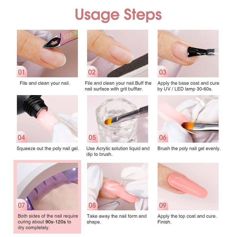 - WARM TIPS & REMOVE TIPS: ROSALIND poly nail extension gels needs to be cured under UV/LED nail lamp. The gel on the sides of the nail takes about 90-120 seconds to fully cure. The time required depends on the thickness of the gel. When removing, a nail drill (not included in this kit) will help you remove faster and cleaner