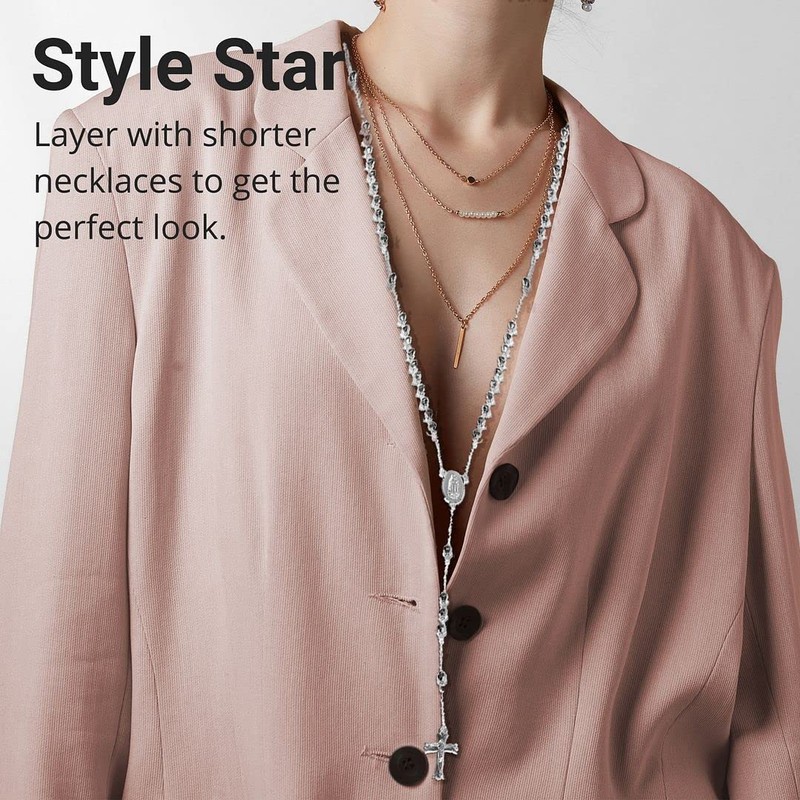 Rosary Necklace for Women - Lariat Cross Necklace in Silvertone - Fashion Rosary Bead Necklaces - 26" Chain Length Jewelry Catholic Faith Christian Religious Christmas Gifts for Women