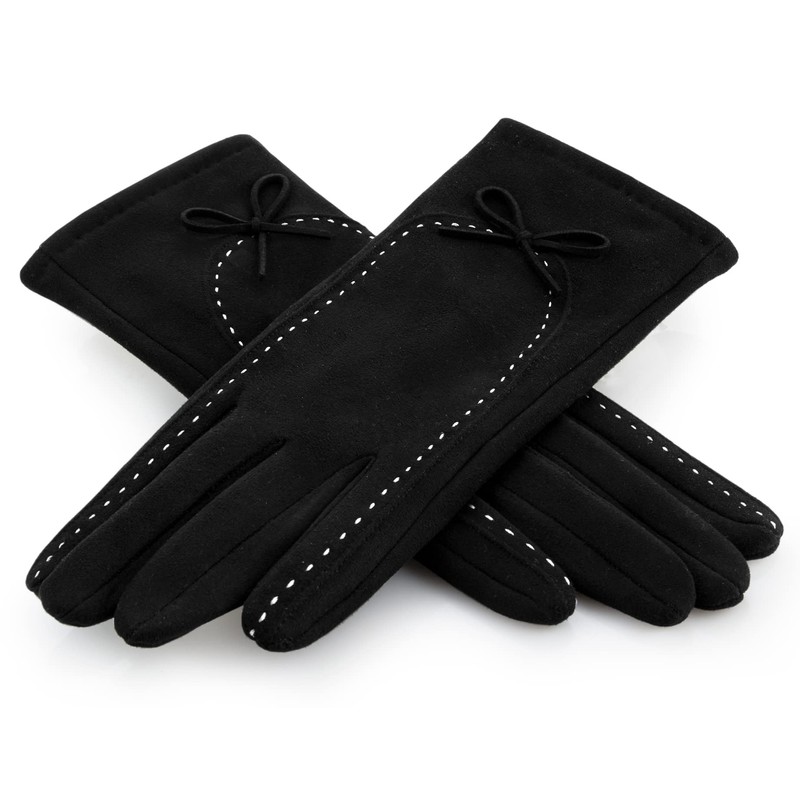 Pleasantly warm and comfortable to wear winter gloves for women with elegant appearance and subtle embellishments - a neat white seam and a cute black bow.
