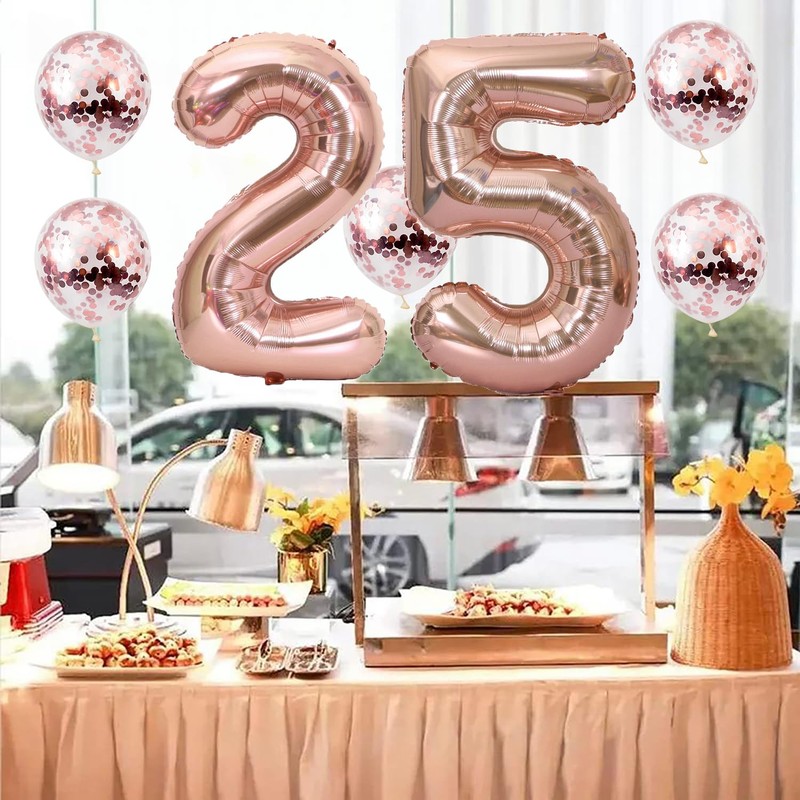 - 1 set rose gold number "25" balloons ,5 pcs rose gold confetti latex balloons,come with 10 glue points ,1 ribbon and 1 straw.