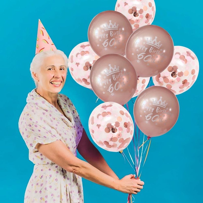 - 20 Pack 12 Inch Latex Balloons: 12pcs Printed “Happy 60th Birthday” Rose Gold Balloons and 8pcs Rose Gold Confetti Balloons as shown throughout our product images. Perfect for using women 60th birthday party.