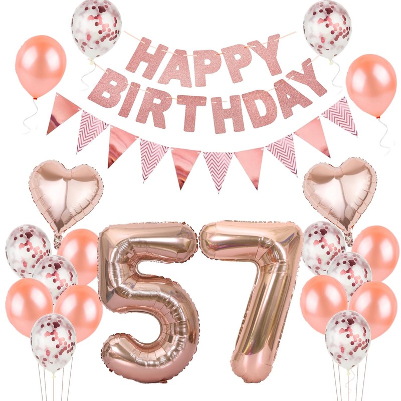 - Perfect rosegold 57th birthday party decoration: high quality rosegold birthday banners, balloon games, perfect decoration for your 57th birthday to create an active atmosphere and better welcome guests. Which will be an unforgettable and special experience. Celebrate with our rose gold decoration balloon set.