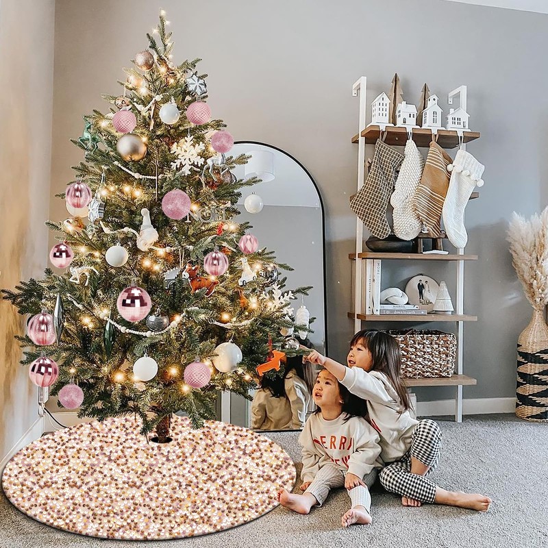- 🎄【Rose Gold Tree Skirt】You will receive a 30-inch diameter small glitter sequin tree skirt, Perfect for a 4-6 ft slim pencil tree. You can put some gifts, Christmas boxes, and Christmas balls on the Xmas tree mat. The sparkle Christmas tree skirt is perfect for decorating your home and becoming part of your holiday tradition.