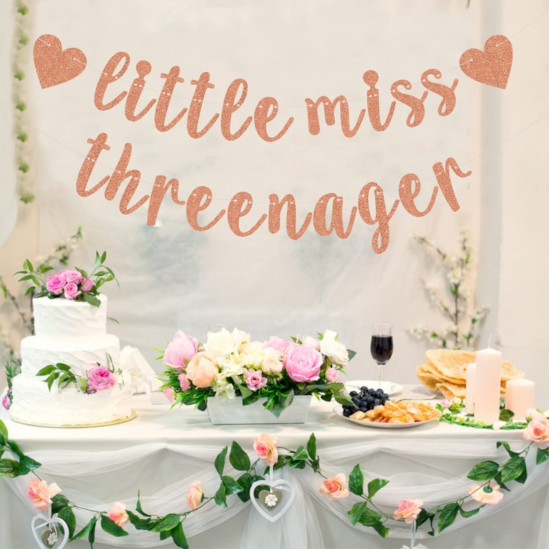 Rose Gold Glitter Little Miss Threenager Banner - Happy 3rd Birthday Banner - Cheers to 3 Years, Girls 3rd Birthday Party Decoration Supplies