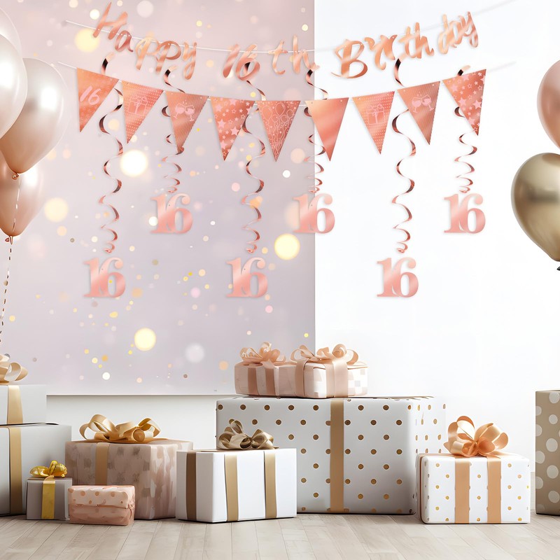 - STURDY AND ECO-FRIENDLY BIRTHDAY BANNERS:Crafted from sturdy eco-friendly cardstock, our 16 birthday decorations for girls include a "Happy 16th Birthday" set, 6 hanging swirls and a triangle banner set. Suitable for prominent display at your celebration