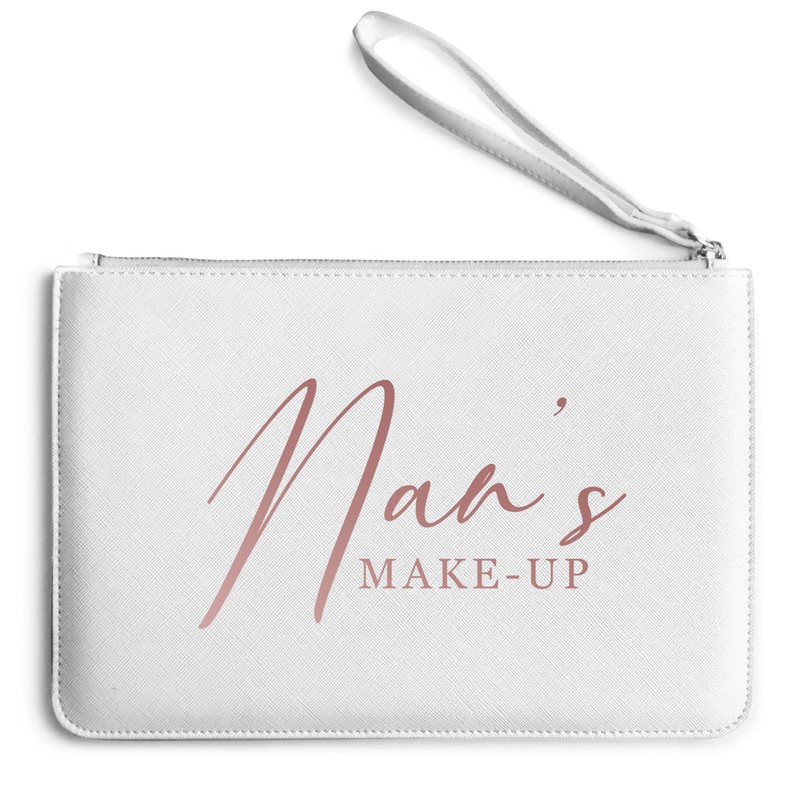 - Rose Gold Nan's Make Up printed on the front of a clutch bag, ideal for your Nanny to keep her make up and hankie in while shes out having lunch with friends