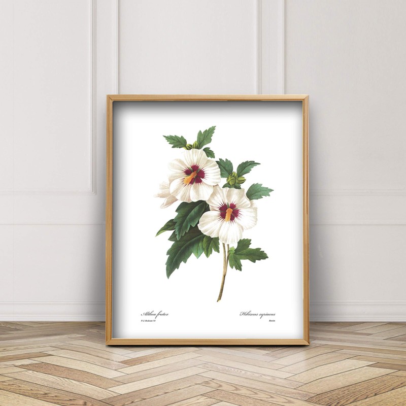 Rose of Sharon Art (White Wall Decor, Botanical Hibiscus Flower Print) Pierre Redoute - Unframed