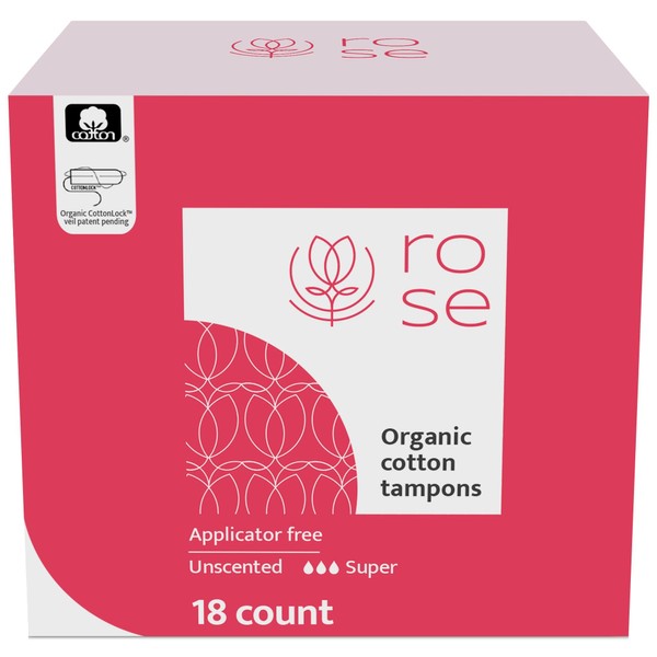 Rose Organic Tampons - Super, Non Applicator, 100% Organic cotton core and security veil, Unscented - 18 Count (Pack of 1)