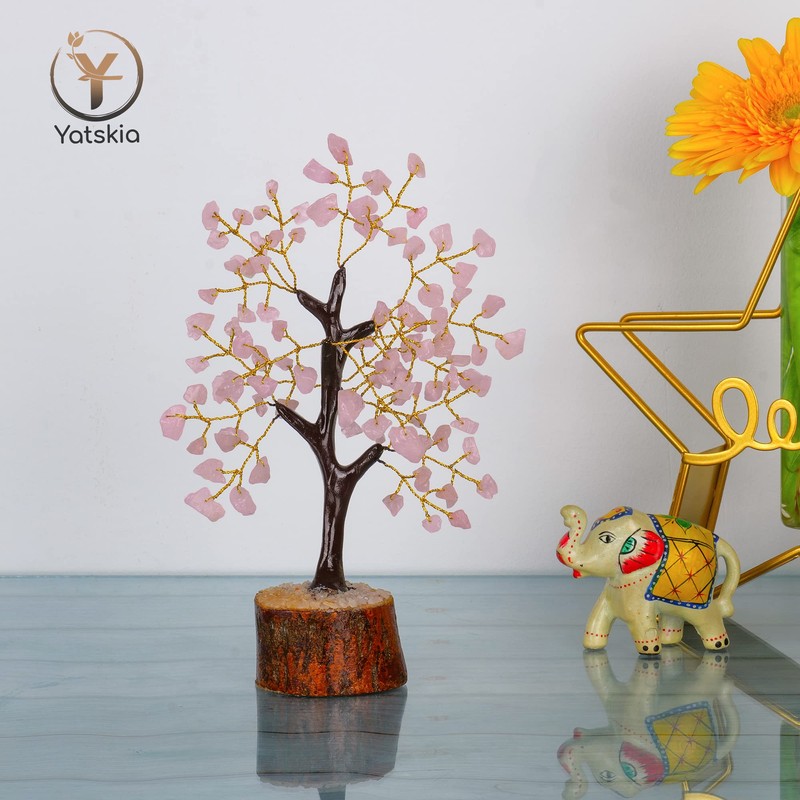 - Rose Quartz Tree - This pink stone tree can be in various sizes. The size of this pink colored crystals and healing stones tree is around 7-8 inches. It has a wooden base and the branches are made up of wire. They are handmade in India from natural crystals.