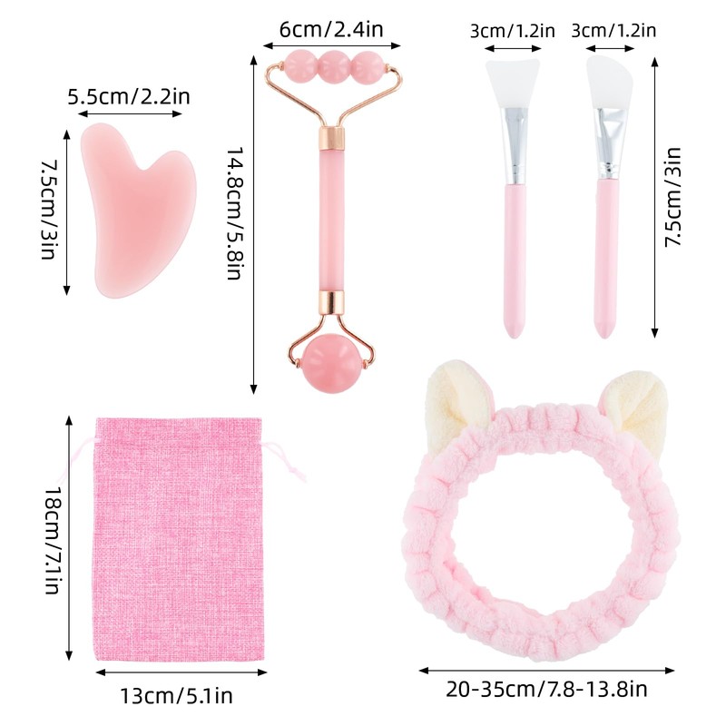 - 3. Our 'massage set' comes equipped with a double-ended jade roller, a scraping stone, two mask brushes, a headband, and a drawstring bag, creating a versatile 6-in-1 grooming regimen to cater all your beauty needs.