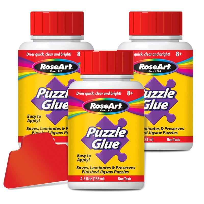 RoseArt Jigsaw Puzzle Glue with Applicator, 3-Pack – Clear Quick-Dry Formula to Seal, Laminate & Preserve Finished Puzzles (4.5 oz Bottles)