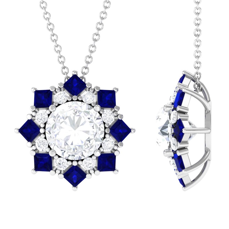 Rosec Jewels Certified Moissanite Sapphire Designer Necklace, D-Vs1 Quality, 8 mm Round Moissanite Bridal Pendant With Silver Chain - Gift For Her, 925 Sterling Silver, With Chain