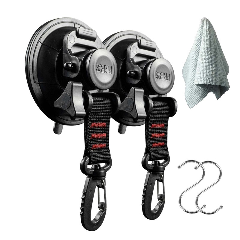 • [Strong Vacuum Suction Cup Hooks] Set Includes: 2 suction cups, 2 S-shaped hooks, 1 towel. 360 degree swivel and lock type hook for maximum freedom of movement. You can use the included towel to wipe the glass before use. If you use it to secure the car side tent or sunshade, you can choose the S hook depending on the type of mounting hole. Suction cup material: PVC + ABS; Size: Diameter 3.5 x Thickness 1.6 inches (9 x 4 cm); Load capacity: 66.2 lbs (30 kg) in stationary stat