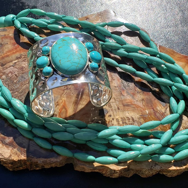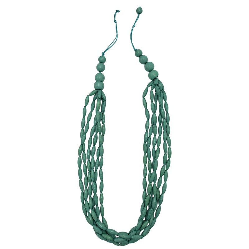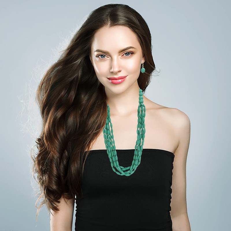 - Glamour bohemio. Con este hermoso conjunto de collar y arete de seis hebras todos los ojos estarán en ti. El collar tiene seis hebras separadas de abalorio que se conectan a un solo cierre de cable. Las abalorio tienen un aspecto único con la forma oblonga facetada que cubre el pecho en un estilo de babero. Las hebras se conectan a abalorio redondas graduadas en diferentes tamaños de 18 mm a 13 mm. Dos pulgadas de extensión ajustable te ayudan a lograr el ajuste perfecto. Viene con arete de estilo gota a juego.