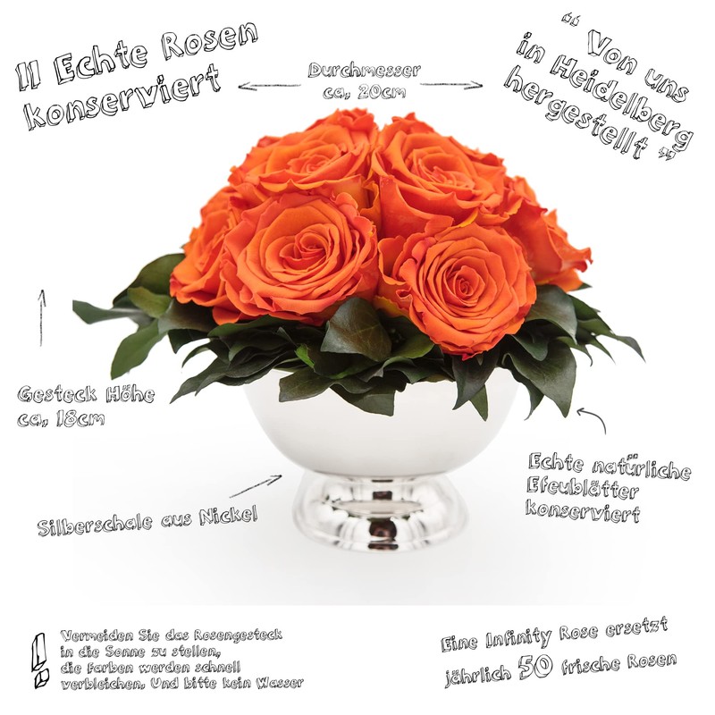 ROSEMARIE SCHULZ Heidelberg Infinity Flower in Silver Cup Eternal Rose Preserved Bouquet Long Lasting (Orange, 11 Roses)
