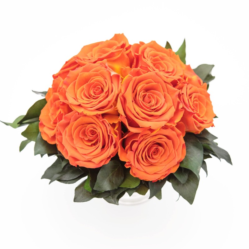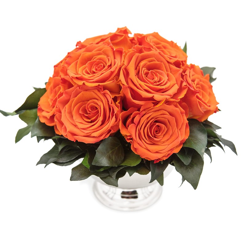 - Infinity flower box arrangement with 11 preserved roses in orange and preserved ivy by hand inserted into a silver-coloured cup