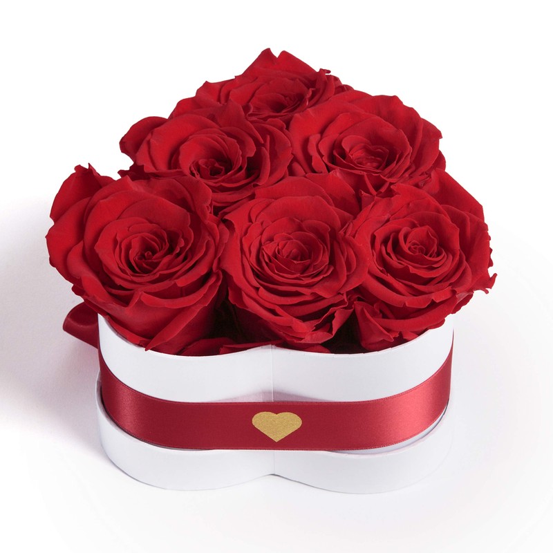 - Flower heart details, the rose box has a height of approx. 10 cm and width and length of 10 cm. Weight of the flower box approx. 120 g. Diameter of preserved roses 5 to 6 cm. The roses are fixed in the box and cannot be removed. Contents: 6 preserved roses in red