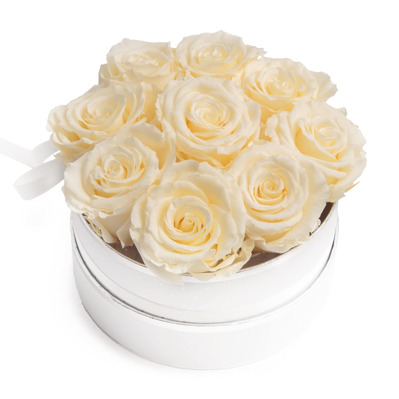 - Round rose box in white with satin ribbon and 8 infinity roses in beige/champagne. Whether as a gift for Women's Day, Mother's Day, for a birthday or wedding anniversary, this rose bouquet is the best way to give an extraordinary gift to a loved one