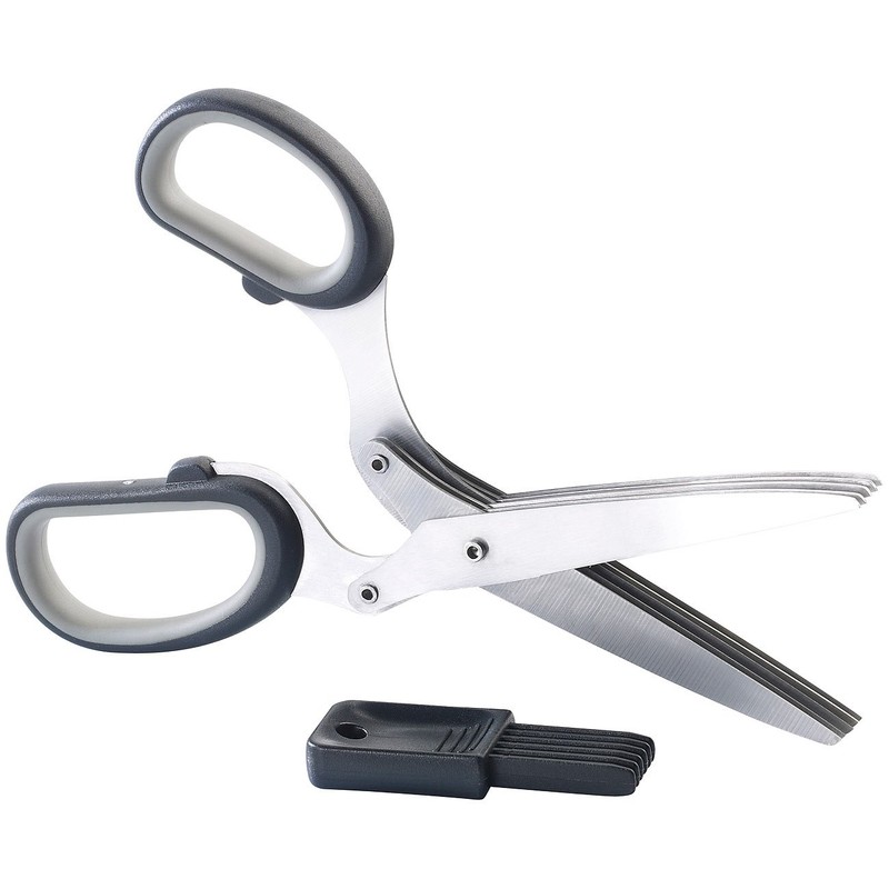- 5-fold herb scissors including cleaning comb and instructions in German. Herb scissors – also relevant or suitable for: household scissors, vegetable cutter, chopping board, garden scissors, kitchen aid, chopper, herb grinder, weighing knife, grilling, spice, knife, BBQ