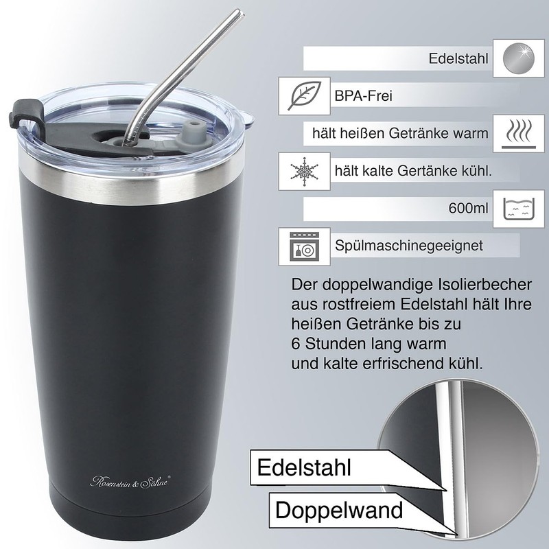 - Double-walled insulated cup. Capacity: up to 600 ml. With 2 lids: a lid with practical straw function. Includes: 2 stainless steel straws and straw cleaning brush. Colour: black. Material: rust-proof stainless steel, BPA-free