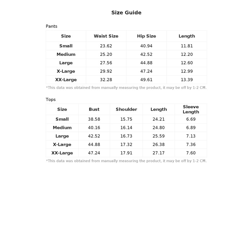 XL:Hip Size:47.2IN,Length:13.0IN,Waist Size:29.9IN,Bust:44.9IN,Length:26.4IN,Shoulder:17.3IN,Sleeve Length:7.4IN