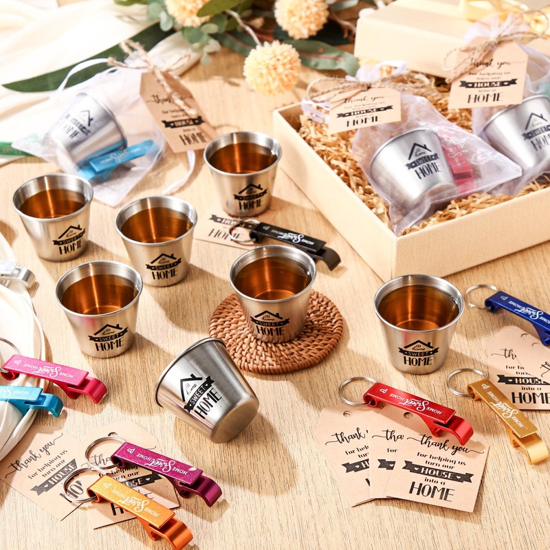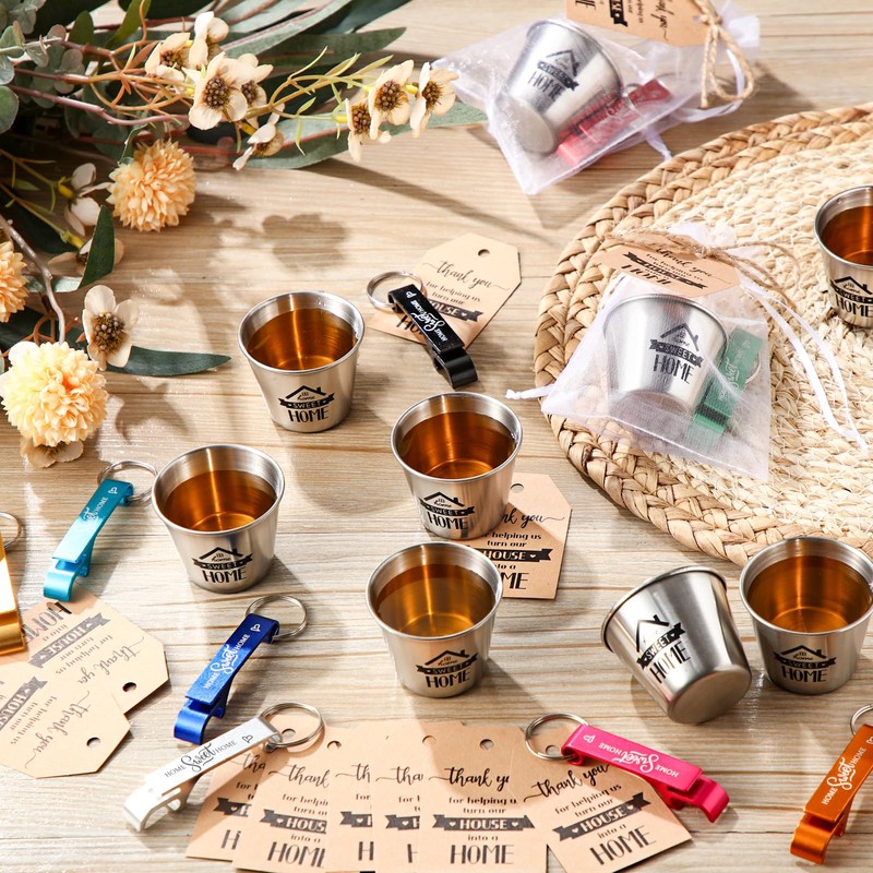 - Housewarming Gift Set: you will receive 20 sweet home shot glasses, 20 bottle opener keychains in 10 colors, 2 of each color, 20 thank you cards, 20 organza gift bags with 1 bundle of twine, which is an ideal housewarming souvenir
