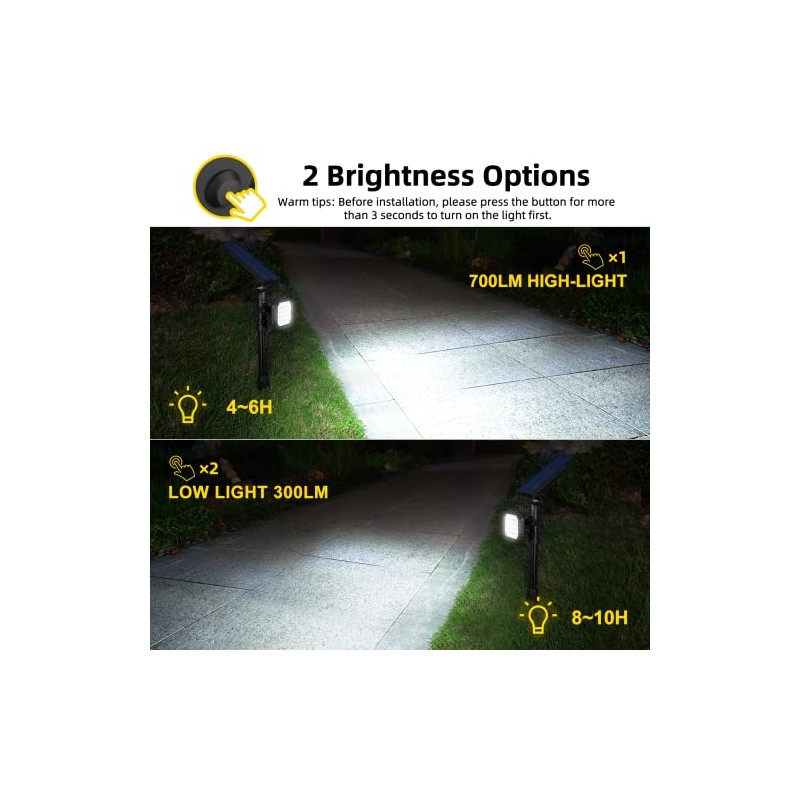 - 【High Efficient Solar Panel】-This solar spotlights adopted monocrystalline silicon solar panel with a solar conversion rate of up to 21%, it will charge the 2200 mAh battery at a faster speed. 90° adjustable lamp heads and solar panels can also be rotated 360° to adjust their orientation in different seasons and locations.