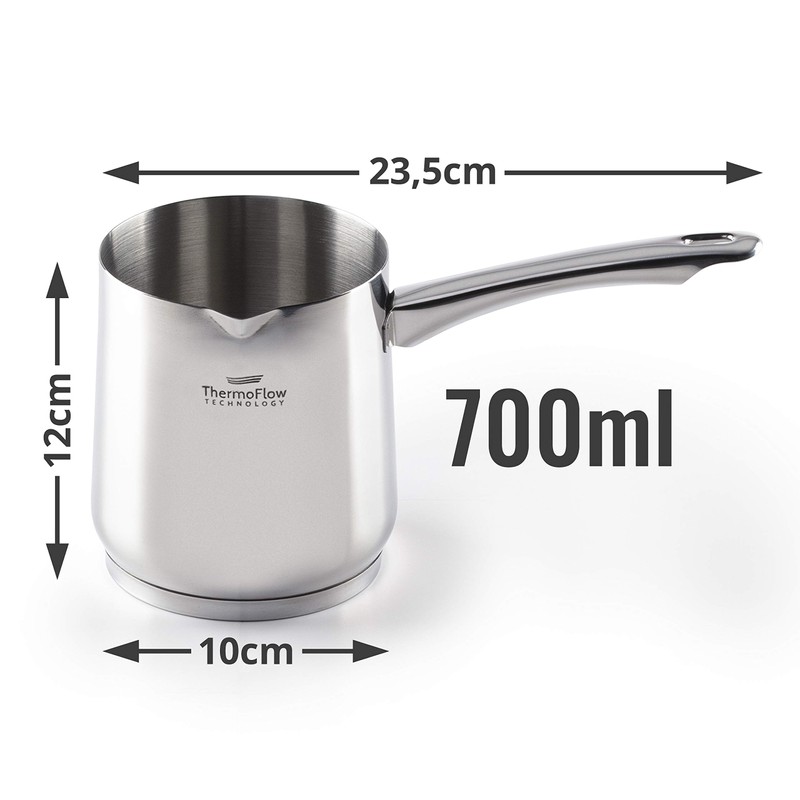 • Thermoflow technology distributes heat evenly and allows faster heating. Made of food-safe 18/10 premium stainless steel, also known as German steel, our coffee pot ensures high durability, resistance and effective cooking. A completely flat 3-layer base and unique body bulge allow for even heat distribution and lower energy consumption, allowing you to heat on lower levels compared to other pots.