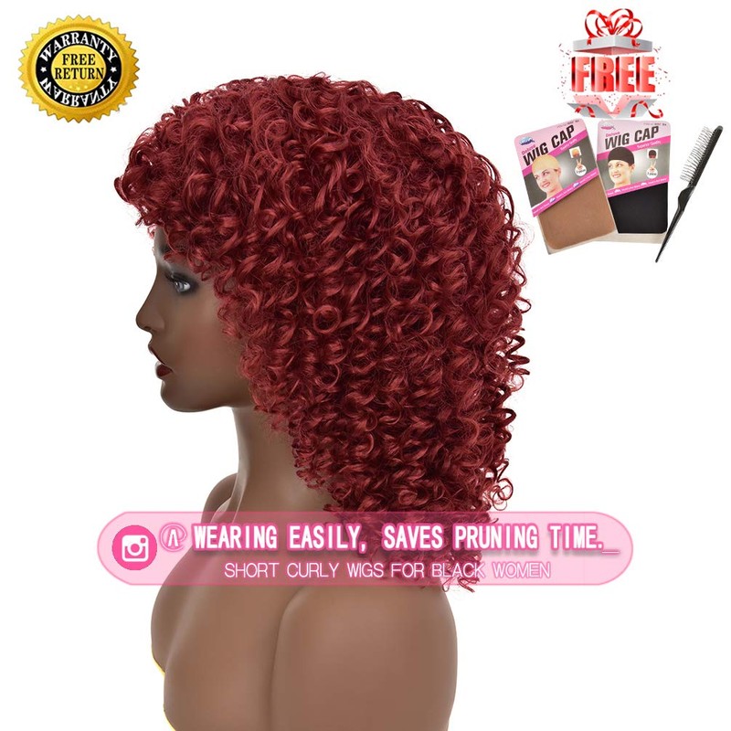 rosmile Curly Wigs for Black Women -Burgundy Synthetic African American Full Kinky Curly Afro Hair Wig with Bangs (Free 1pc Professional Wig Comb and 4pcs Wig Caps)