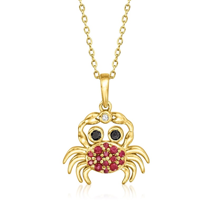 Ross-Simons 0.30 ct. t.w. Ruby and .10 ct. t.w. Black Spinel Crab Pendant Necklace With Single Diamond in 18kt Gold Over Sterling. 18 inches
