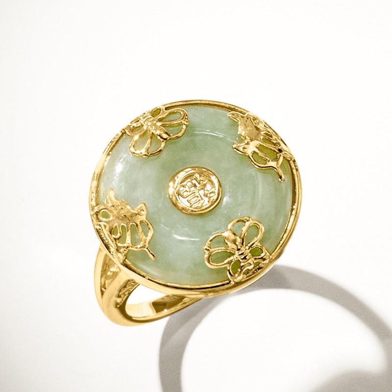 - JADE AND 18KT GOLD OVER STERLING — Jade "good fortune" butterfly ring in 18kt yellow gold over sterling silver. 18x4mm round carved jade. Polished finish. 3/4 in. wide. Size 8.