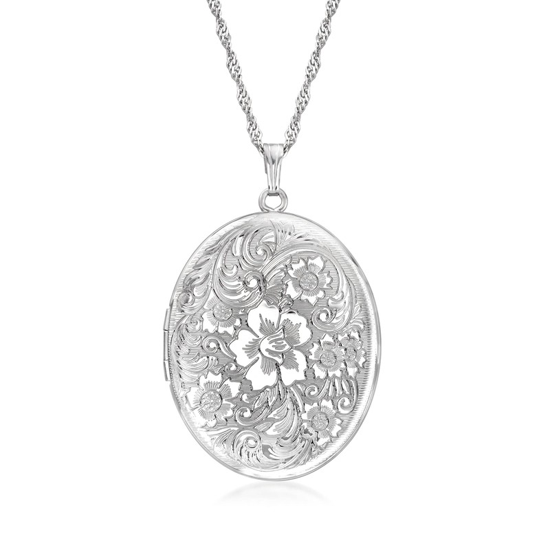- STERLING SILVER — Sterling silver personalized floral locket pendant necklace. Polished finish. Single bale pendant measures 1 3/4 in. long by 1 1/8 in. wide. Can be engraved FREE on the back with a three-letter monogram in script or block font. Singapore chain adjusts from 24 in. long to choker length by way of a sliding mechanism. 8.0 grams. Lobster clasp.