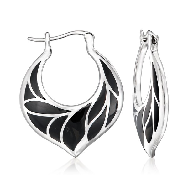 Ross-Simons Onyx Leaf-Pattern Hoop Earrings in Sterling Silver