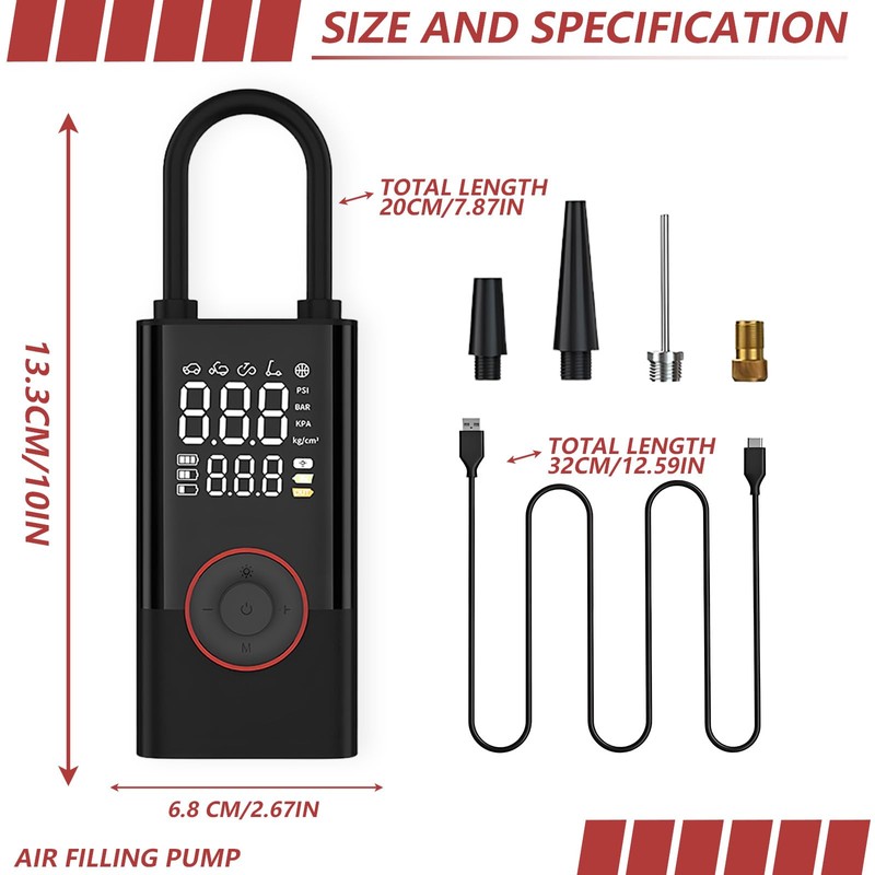 • Automatische abschaltung & genaue druckmessung: Diese Luftpumpe ist mit einer digitalen Druckanzeige ausgestattet, die eine genaue Druckmessung ermöglicht. Wenn der eingestellte Druck erreicht ist, schaltet sich die Akku Luftpumpe automatisch ab, um ein Überfüllen zu vermeiden und die Reifen zu schützen. Sie ist ideal, um ein sicheres Aufpumpen zu gewährleisten
