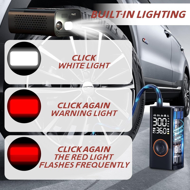 3.80W-Motor (150 PSI) füllt Reifen blitzschnell. Robustes ABS-Gehäuse, für langen Einsatz!