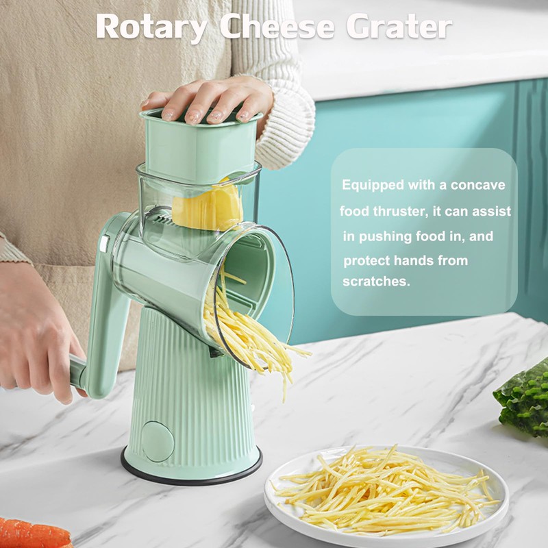 The rotary grater is equipped with five sets of stainless steel blades that are easy to install and disassemble to to meet shredding, slicing, chopping, and grinding.