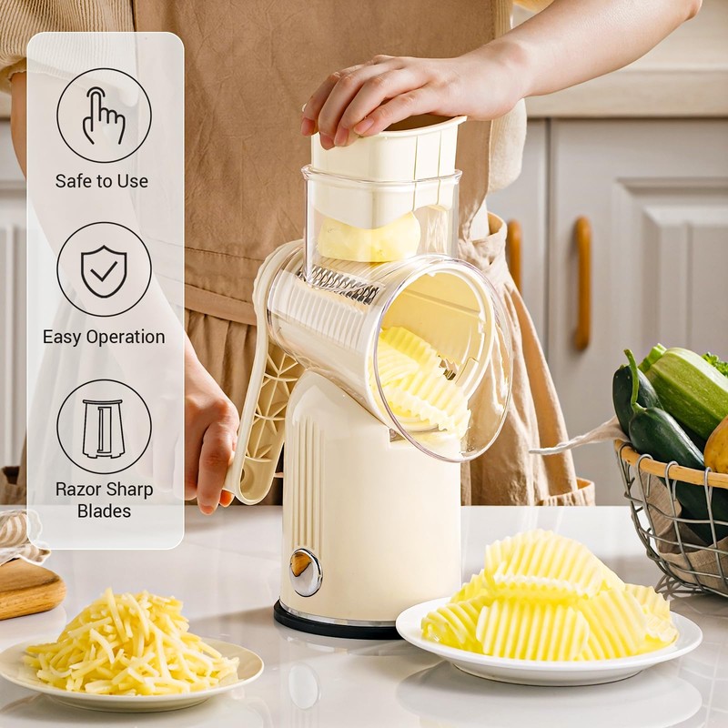 - 【Versatile 5-in-1 Functionality】Cheese grater has 5 sets of replaceable stainless steel blades, which can be easily replaced for slicing, shredding, grinding, and create wavy cuts. From grating cheese to slicing vegetables like zucchini and carrots, this versatile grater easily adapts to all your food preparation needs.