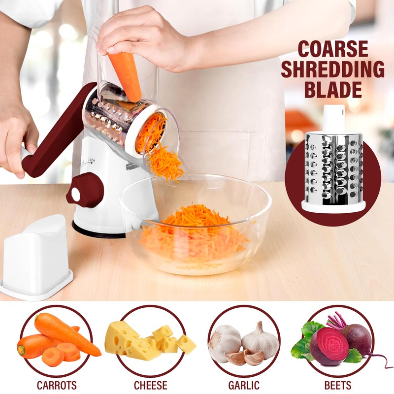- 🥕Top Tier Multi Purpose Grater - Why have a bunch of different kitchen gadgets that do all different functions when you can get one device that can do many. With the Phelya Rotary Cheese grater you will 3 blades that all serve different functions. One Coarse shredder for things like carrots, cheese and potatoes, One Fine shredder/ grinder for things like nuts, breadcrumbs, chocolate, cookies and a Mandoline Slicer for things like cucumber, radish, cheese, zucchini and potatoes.