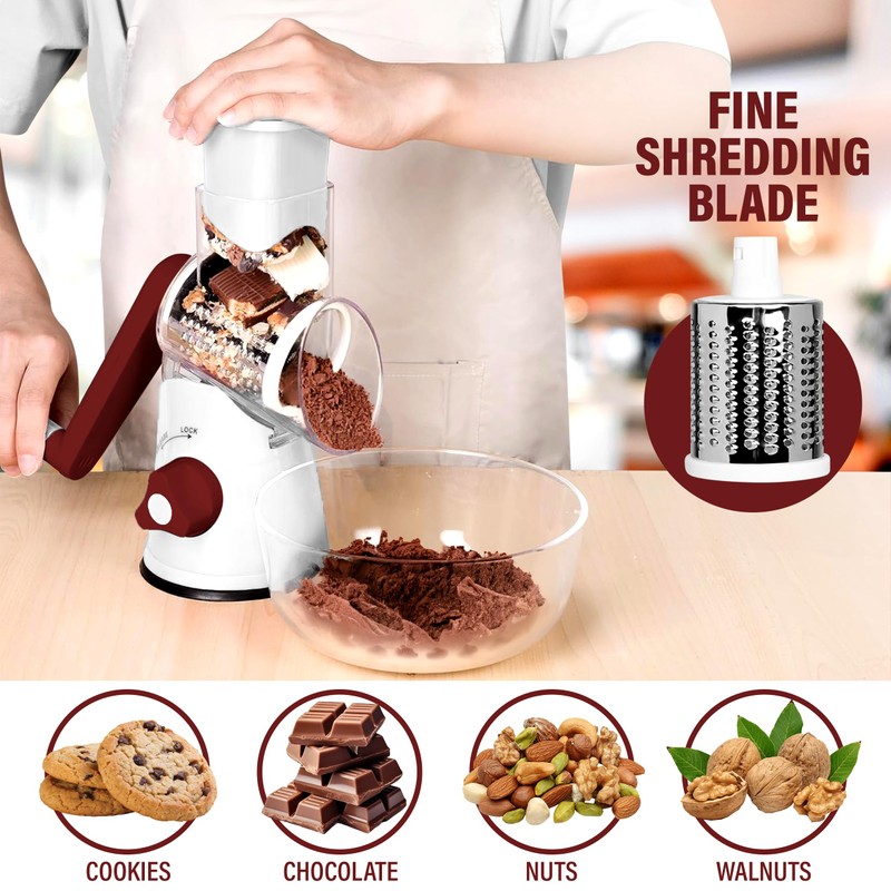 - 🥕Versatile and easy to use- setting up to grate, slice and grind your ingredients has never been easier. In as little as 3 step your Rotary cheese grater is ready to use. With the 3 interchangeable blades that come with every order, there is an unlimited amount of things you can slice, grate and grind. Be it cheese, vegetables, nuts and even chocolate, Phelya rotary grater can do it all.