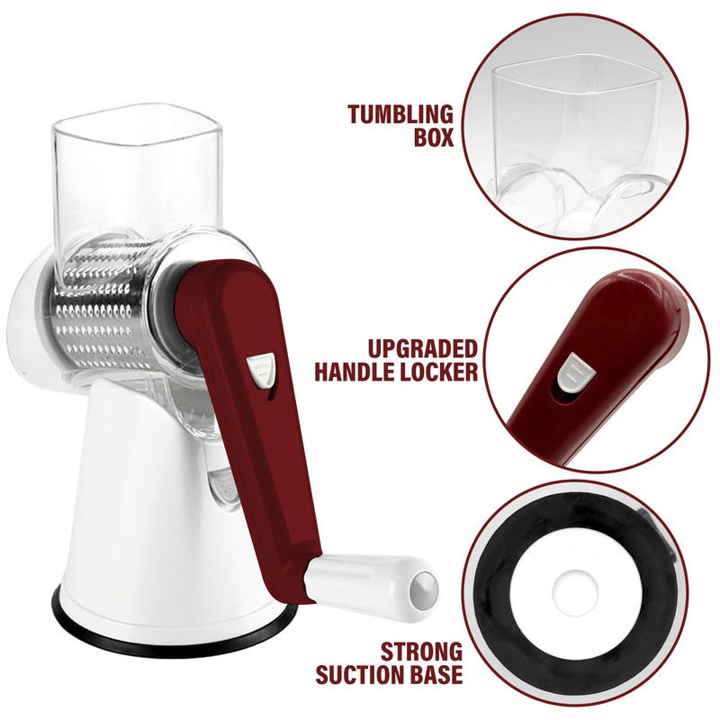 Rotary Cheese Grater, Kitchen Mandolin Slicer Cheese Grater with Hand Crank, and Grinder with 3 Stainless Steel Blades and Strong Suction Base.