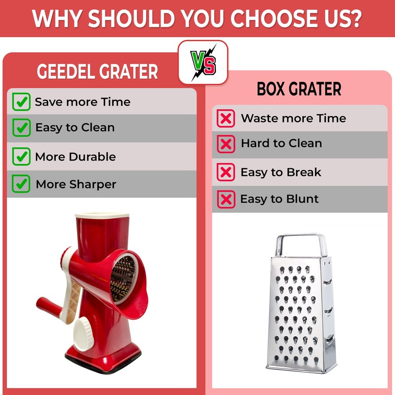 - Hand Crank Design: Our cheese grater features a classic hand crank design for effortless grating. it allows precise control over the grating process, accommodating various types of cheese.