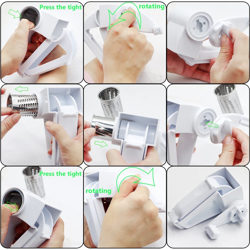 - 【Warm Tips】When you use the rotary cheese grater, please clockwise turn the drums handle and pay attention to the food size what the grater can use.Don't touch the blade directly with your hands.