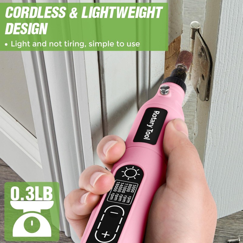 - 【Compact and Lightweight Portable】The cordless rotary tool is lightweight and easy to hold, with a sleek ergonomic design, when you use it, it's like having a pen, and the light feel reduces hand fatigue, allowing you to work for hours without feeling tired. Due to its compact, lightweight, and cordless design, the cordless rotary tool kit is ideal for fine crafting and DIY projects.