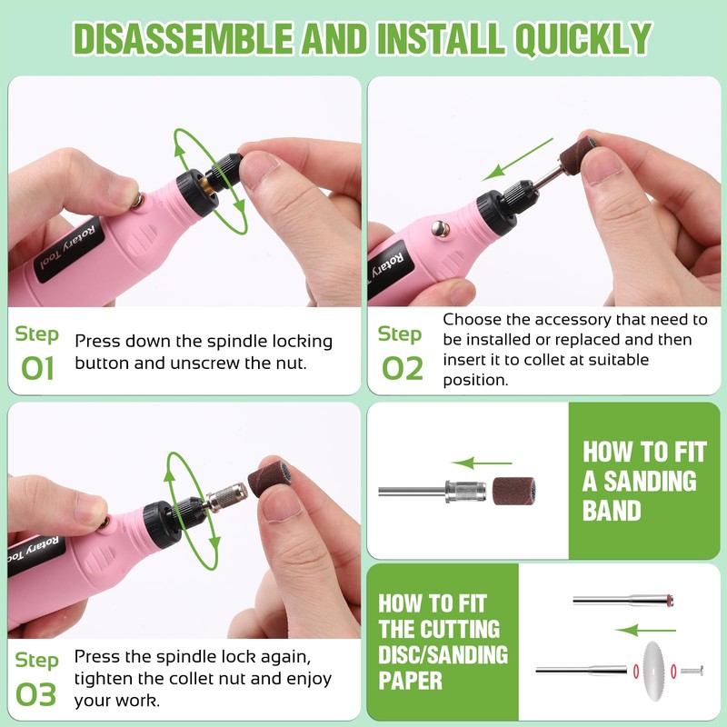 【5-Speed Settings】 Mini rotary tool has a 5-speed variable speed adjustment from 5,000 to 18,000 RPM, which can meet the gears and speeds required for different light load projects. Even if you're a beginner, you still can experience effortless control joy. Easy and convenient speed adjustment for small rotary tools, which can meet your DIY creation needs at all stages.