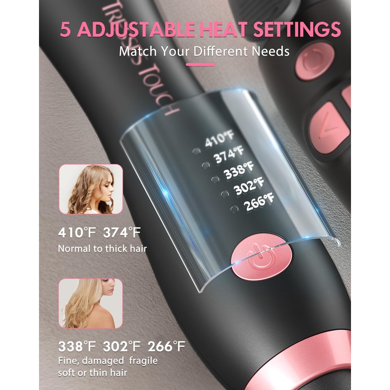 - Adjustable Temperature Setting & User-friendly: Hair curling iron with five adjustable heating levels from 266°F-410°F (140℃-220℃) suitable for all hair types, providing optimal temperature for better and longer-lasting curling effects. Meanwhile, its 60-minute auto shut-off feature should give you peace of mind when you leave it after careless use. Plus, our rotating curling iron is dual voltage (100v-240v) for travel convenience