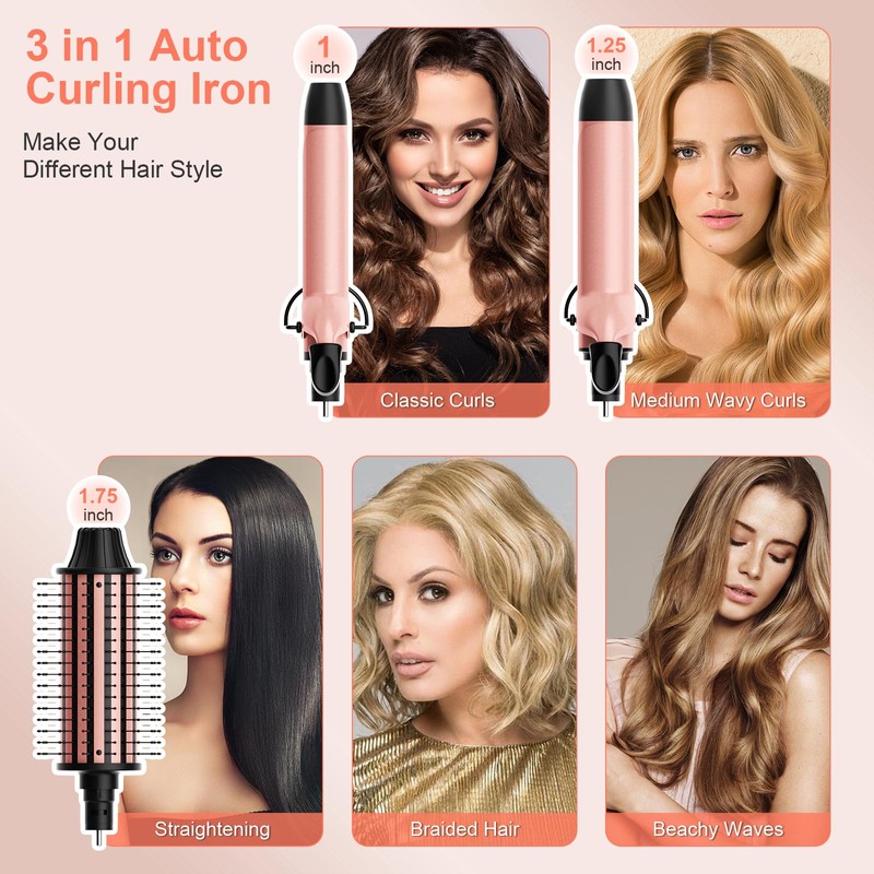 Rotating Curling Iron, 3 in 1 Automatic Curling Iron 1, 1 1/2, 1 3/4 Inch, Thermal Brush Set, Ionic Ceramic Barrel Hair Curler, Fast Heating,Travel Dual Voltage Self Curling Wand for Beach Waves