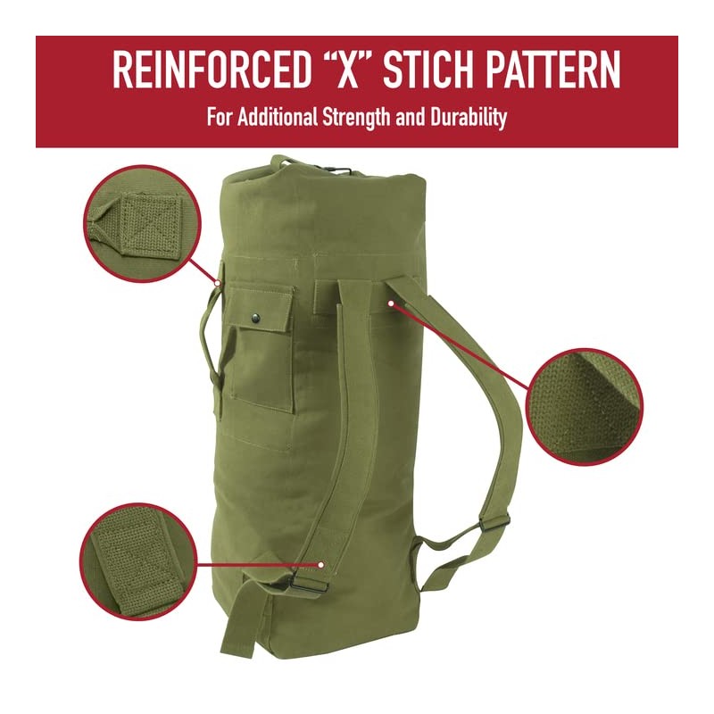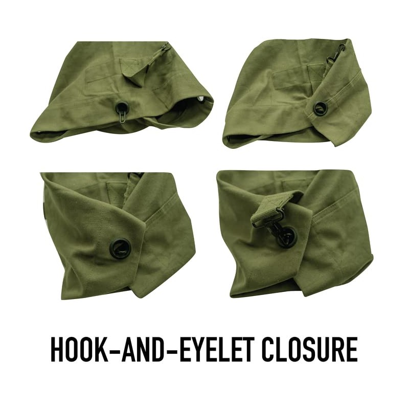 - RUGGED G.I. CANVAS DESIGN: The G.I. Style Canvas Duffle Bags feature a top loading layout that makes it easy to pack and store large amounts of clothing and gear. After packing, secure your belongings inside with the metal hook-and-eyelet clip closure. There’s also a snap-button closure side pocket for quick access to small items.