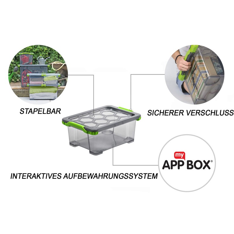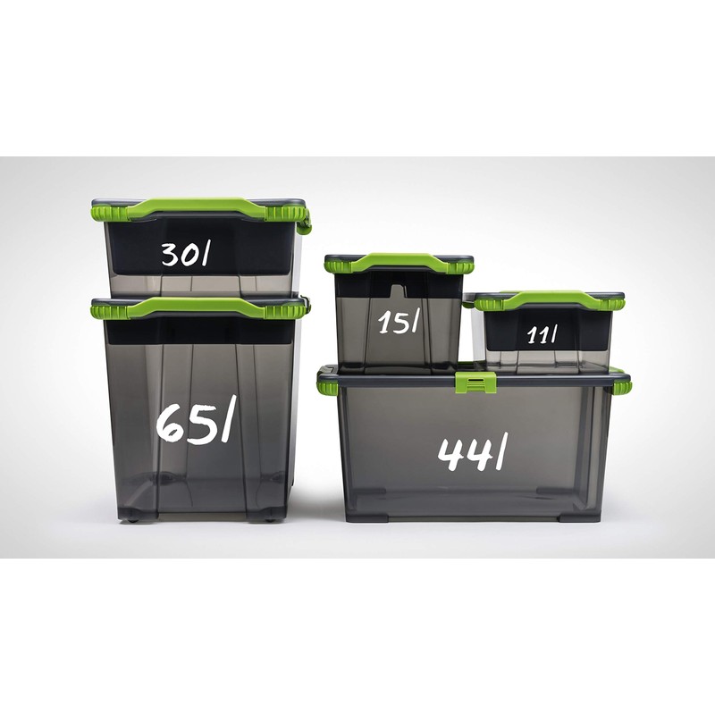 - Dimensions: 39.3 x 28.3 x 16 cm (L x W x H), inner dimensions: 26.1 x 20.5 x 14.7 cm (L x W x H) – grey clip box with volume: 11 litres – stacking box colour: anthracite translucent, green handles